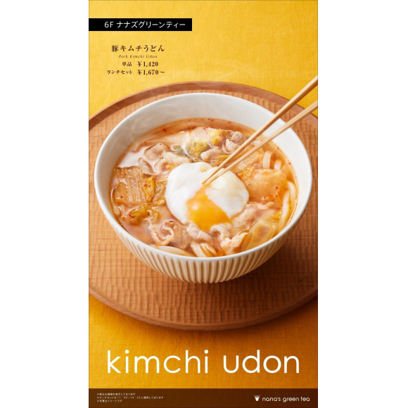 2024년 시즌 메뉴에서 호평을 받은 메뉴가 다시 등장.「냄비」에서 친숙한 돼지 킴치를 nana's green tea 바람에 어레인지한, 우동 메뉴입니다.우동의 국물은 가게 구입.부드러운 맛으로 김치의 매운맛을 돋보입니다.토핑 온천 계란으로 부드러운 맛도 즐길 수 있습니다.돼지고기는, 불을 통해서도 딱딱해지기 어렵고, 따끔한 입맛이 특징인 홋카이도산 돼지 로스를 사용맑은 우동 유에 품은 기름의 맛이 녹아듭니다.